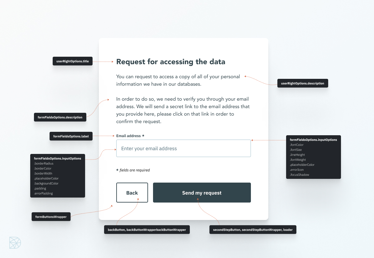 To edit Privacy request widget design, you need to edit the layout-component `dsar_form` by sending a **PATCH** request on `/widgets/layout-components/{layout-component-id}` and specifying options in `options` property.