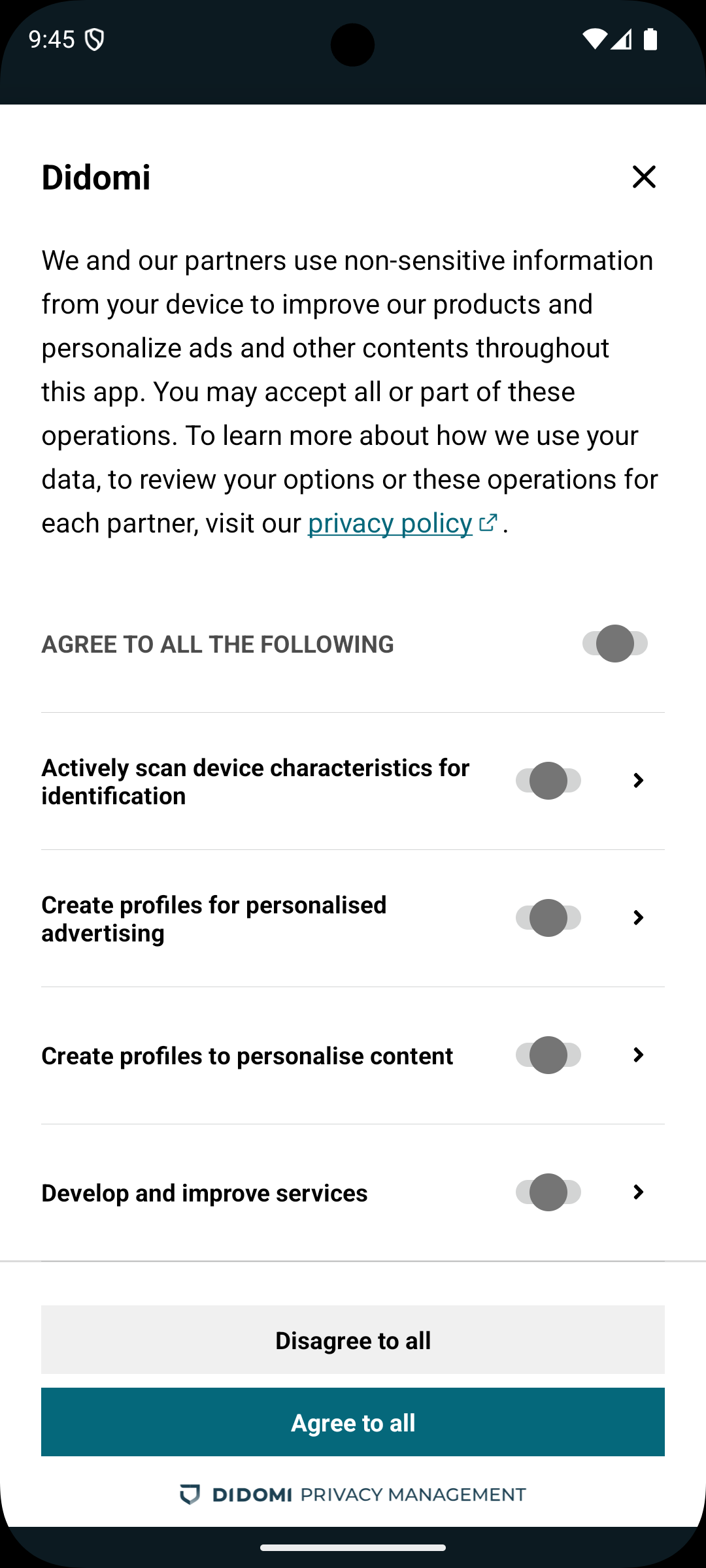 On mobile devices, by adding the `disableButtonsUntilScroll` flag into the preferences section of the config file and setting it to `true`, the `Agree to all` and `Disagree to all` buttons of the Purposes view will be blocked/disabled until the user scrolls to the bottom of the screen in order to see all the purposes.