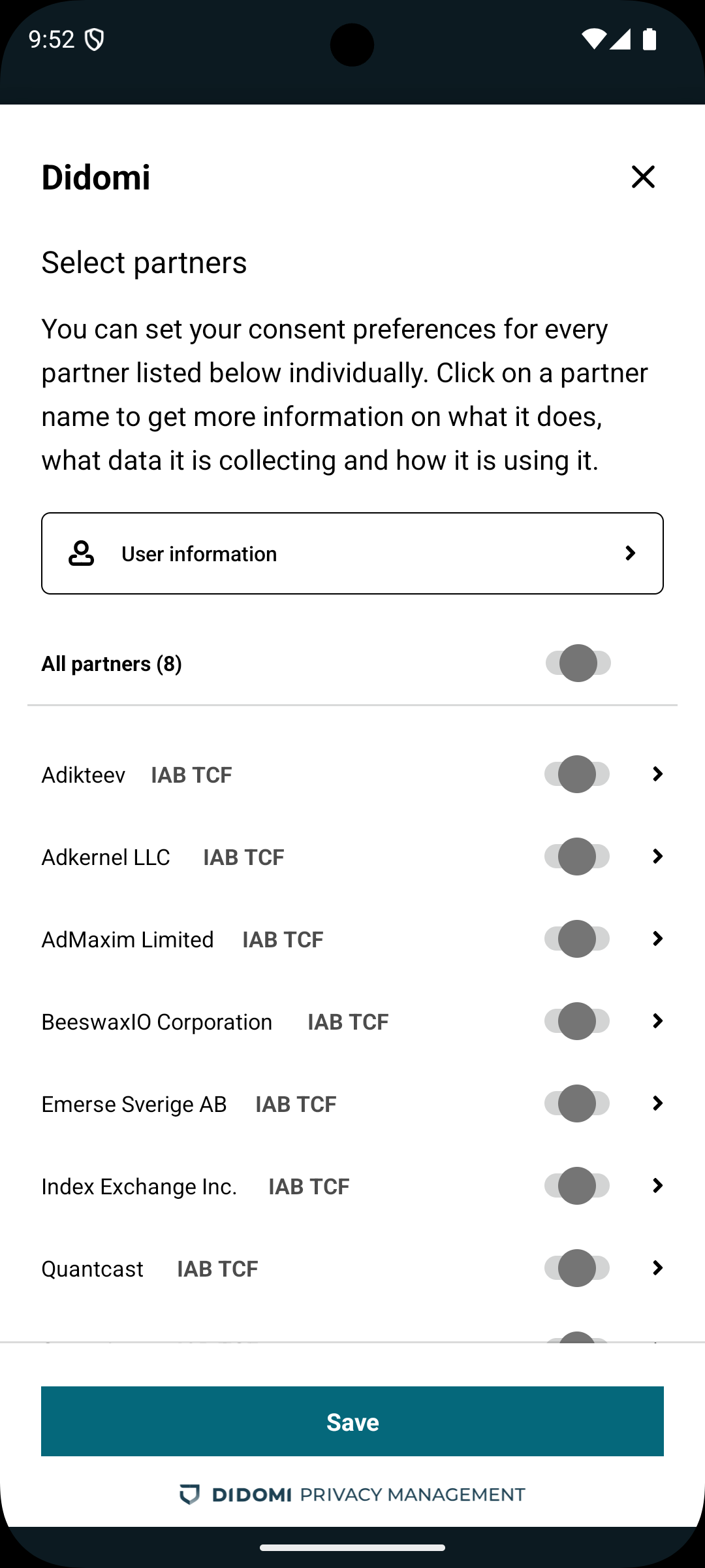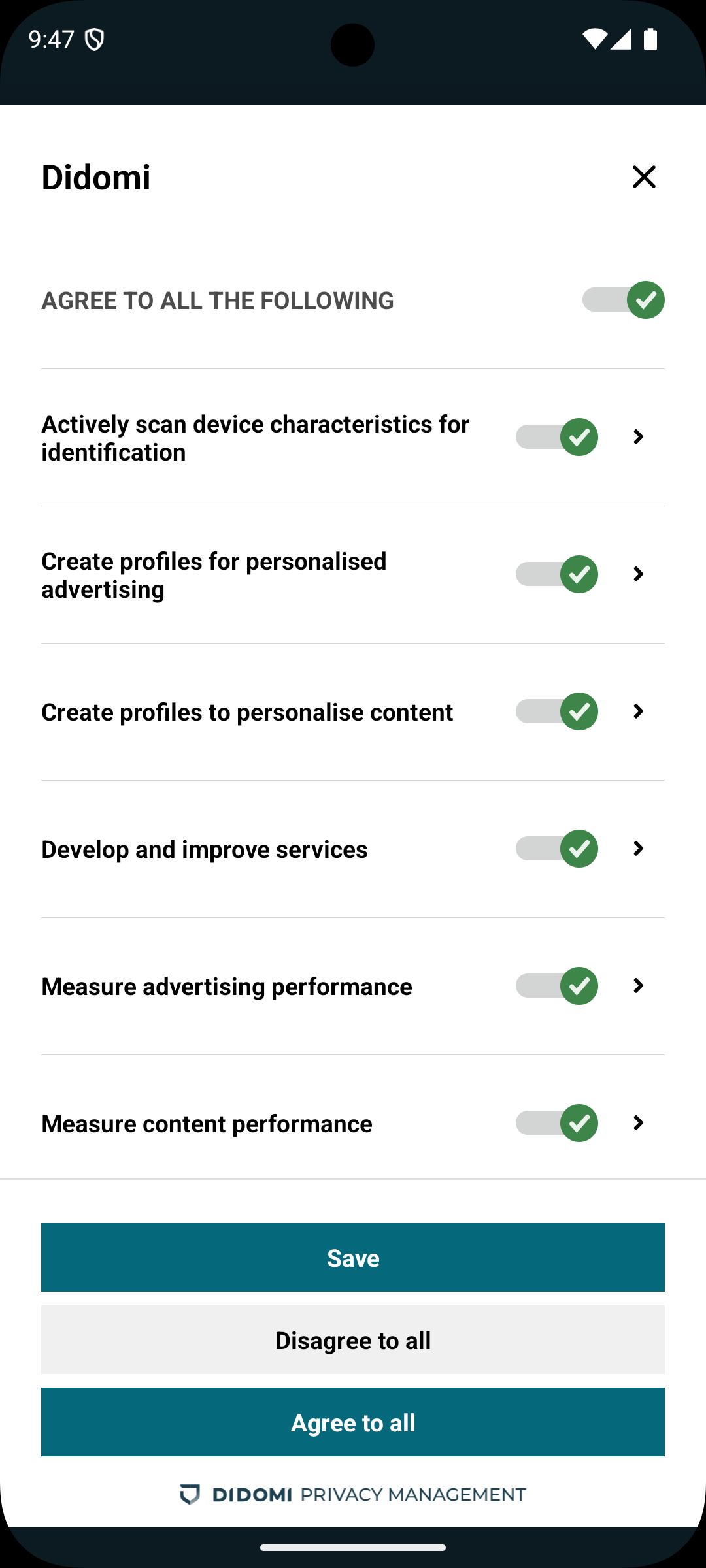 By default, on purposes screen on mobile, "Agree to all" and "Disagree to all" buttons are only visible if no choice was made by the user (all purposes are in Unknown state), and "Save" is only visible if the user started to express its choices.