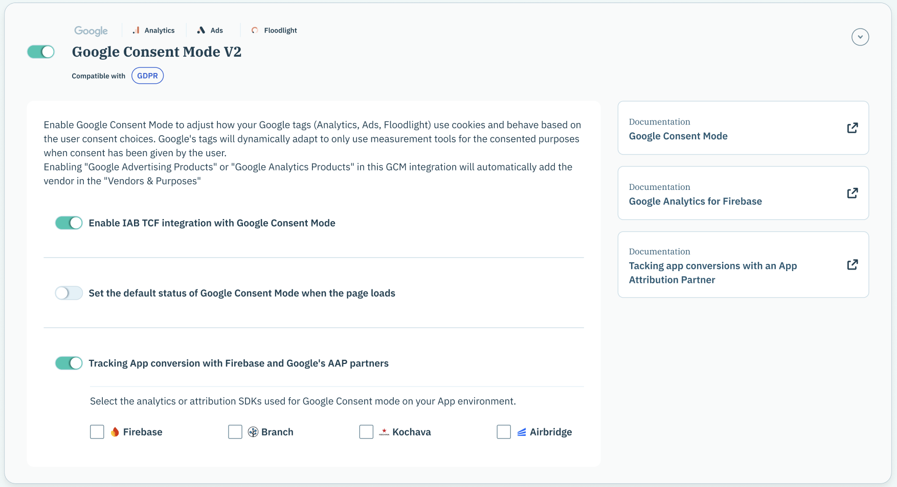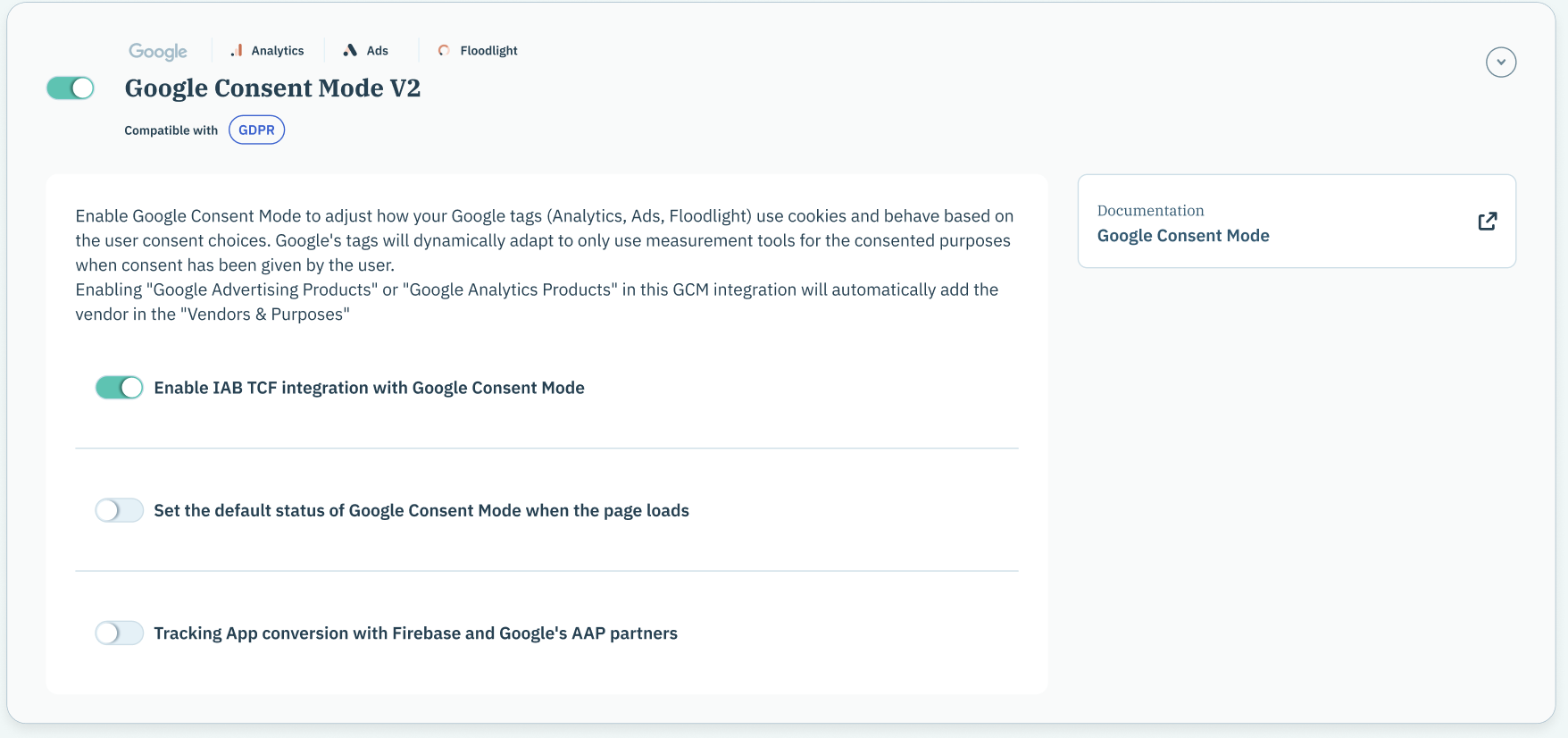 You can optionally enable Consent mode's TCF integration which will allow setting consent mode status from the user’s choice in the TC string.