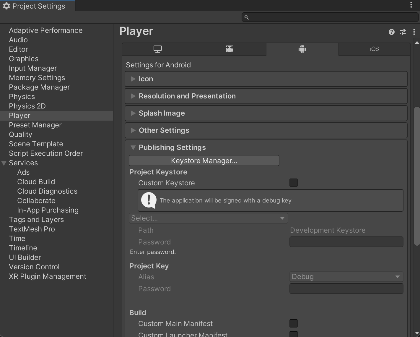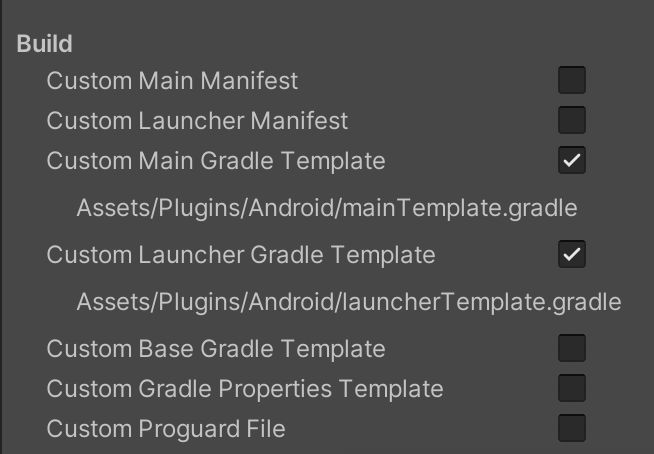 * In Player settings, in Android section, activate `Custom Main Gradle Template` and `Custom Launcher Gradle Template`