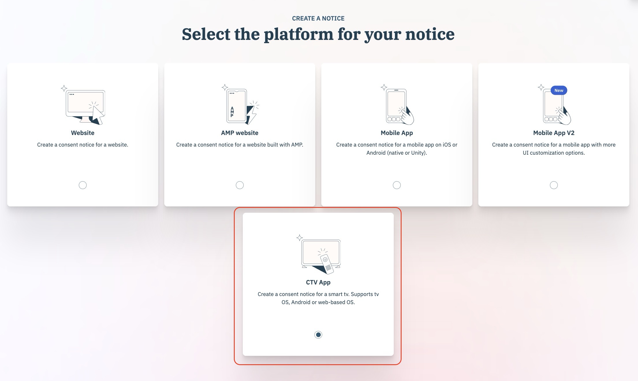 Make sure that the notice that you will set up has been marked as CTV type (rather than Web) on the Console. See <https://support.didomi.io/create-a-consent-notice-for-connected-tv-new-flow> for more information.